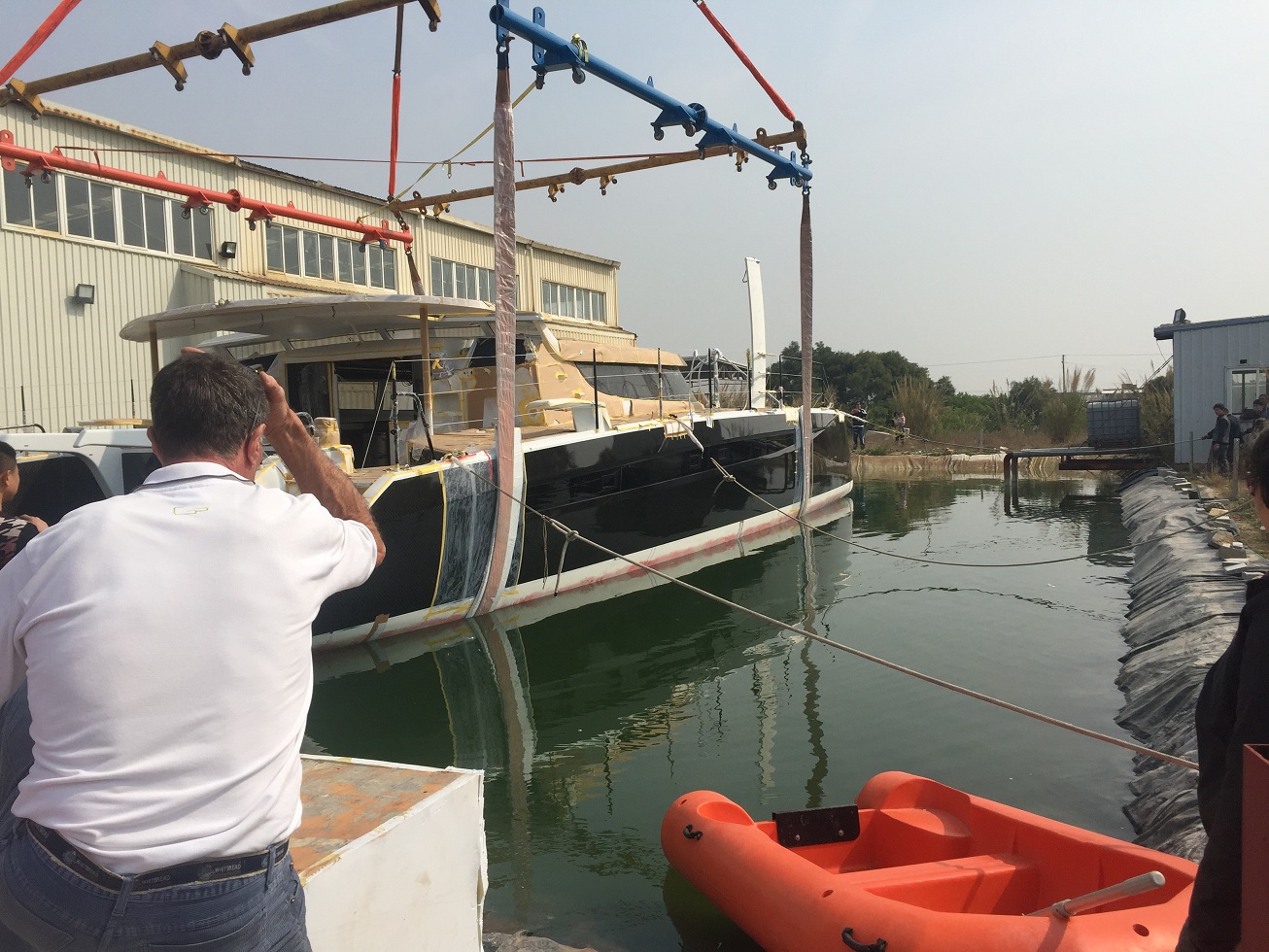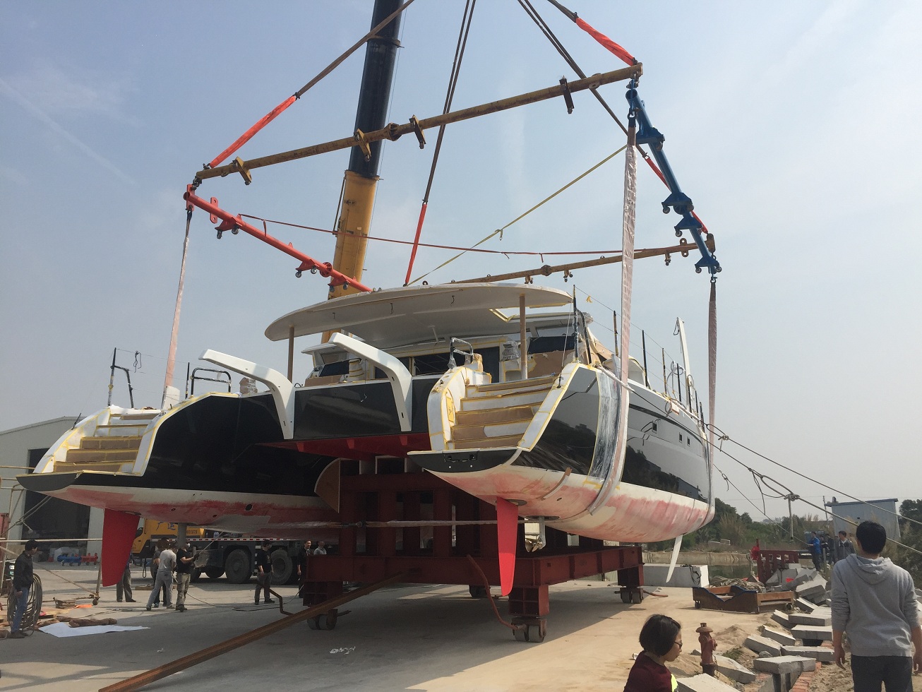 2013年3月6日,哈德森HH66呎双体帆船在工厂吊装试水。