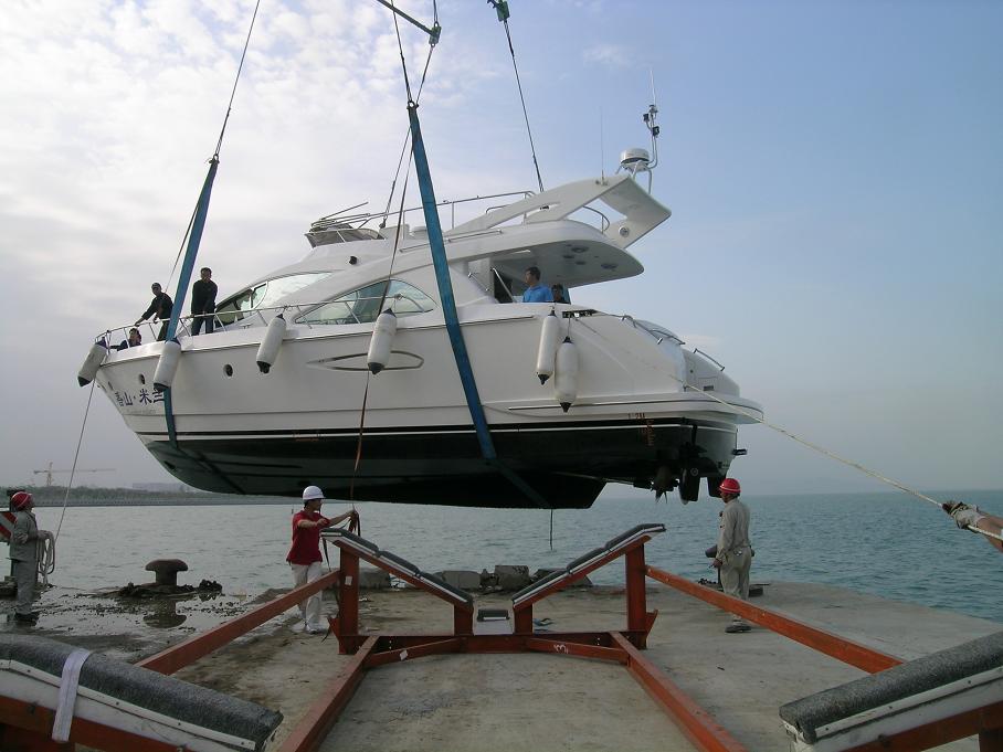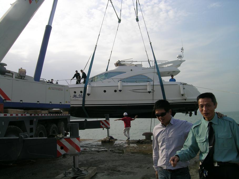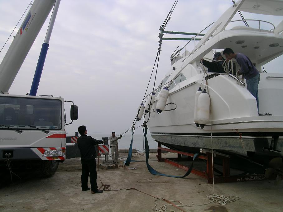 、20吨游艇由五通码头吊上岸保养。